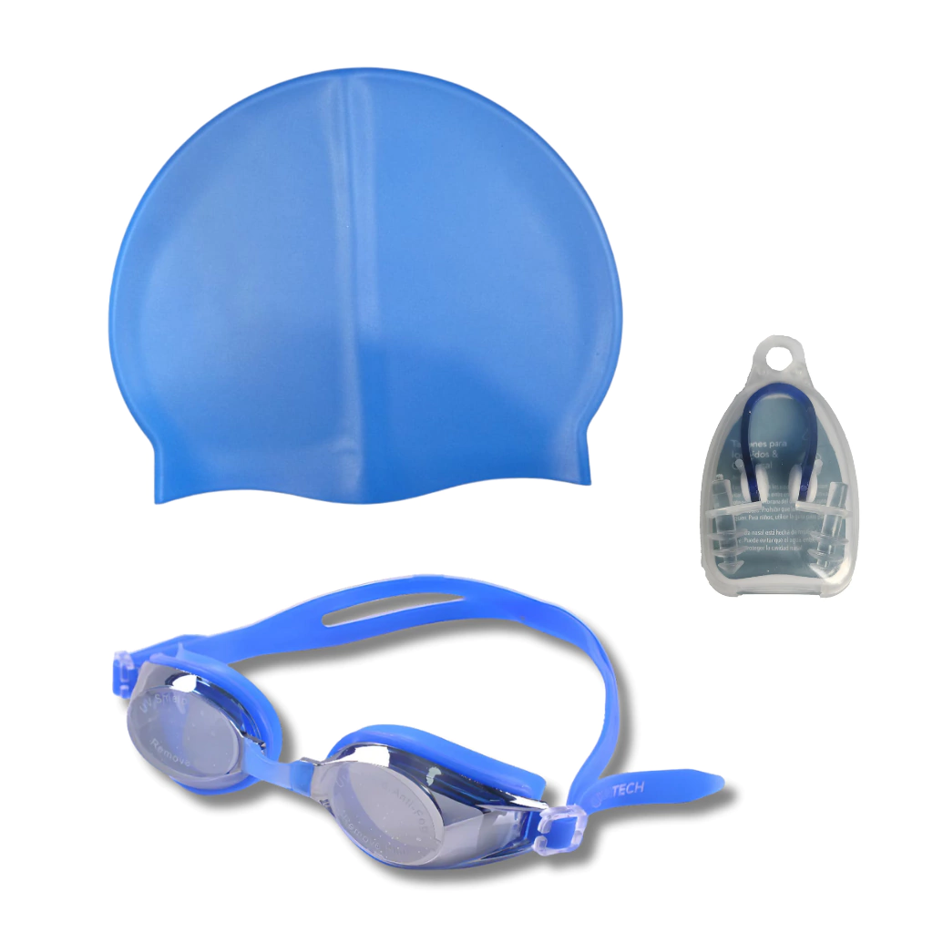 El precio publicado corresponde al set completo (antiparras + clip nasal + tapones + gorro + estuche).