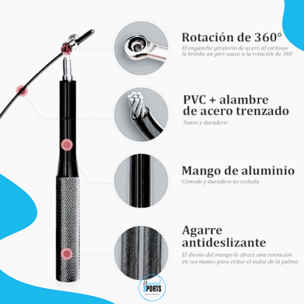 Con rodamiento metálico y cabezal giratorio de 360°, esta cuerda garantiza movimientos rápidos y precisos, ideal para entrenamientos de alta intensidad.